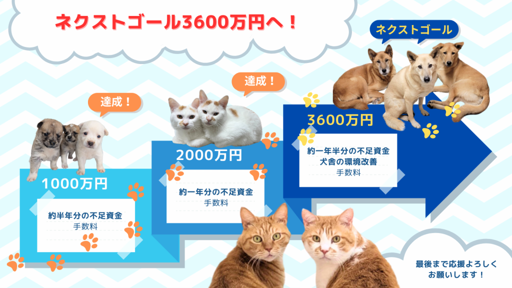 第三目標は3600万円を掲げて、もう半年分の不足資金と犬舎の環境改善を目的として挑戦します。