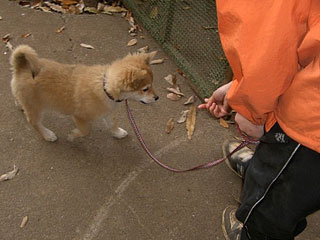 3. 犬が途中で嫌がって立ち止まったり匂いを嗅いで動かなくなってしまったら、ぐ~っという感じでリードを引き、おやつやおもちゃなどで自分のほうへ呼びよせます。犬がそれに反応して寄って来てリードがたるんだ状態になったらよく褒め、おやつを与えます。