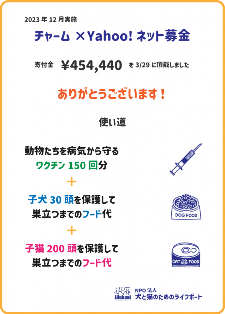 昨年12月にも「チャーム×Yahoo!ネット募金」を実施していただき、過去最高額の454,440円をご寄付くださいました!