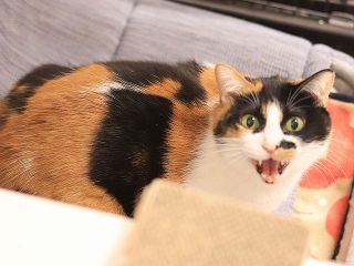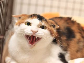 やや長毛な毛並みを逆立てて警戒心剥き出しです。 -