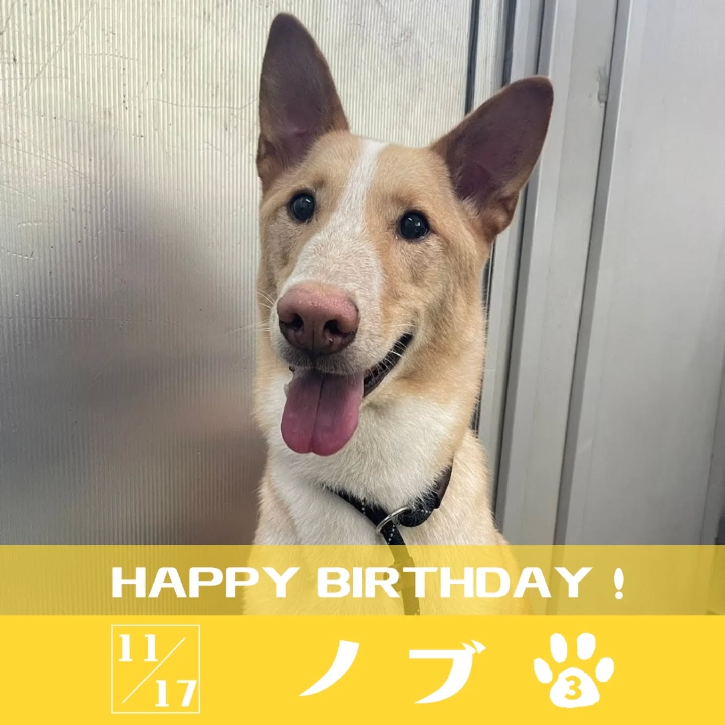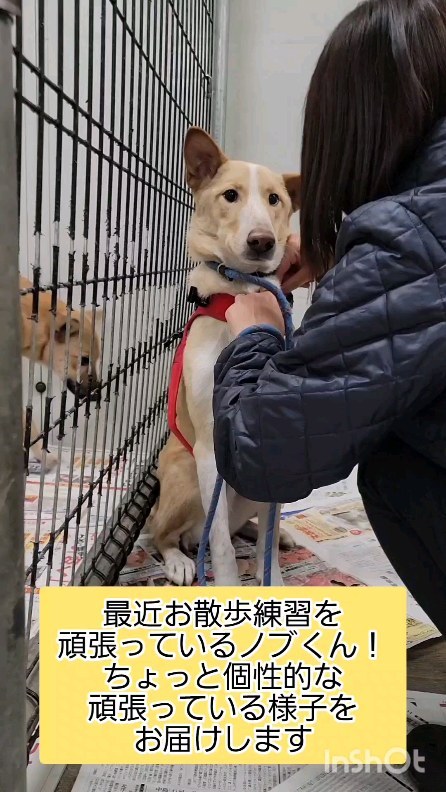 他の犬がいない状況で、人とノブとの一対一だとまだまだ「僕は今とても緊張しています…」と不安げなお顔になりますが、そんな風に色んな表情を見せてくれるようになったことも大成長だねとスタッフみんなで喜んでいます。